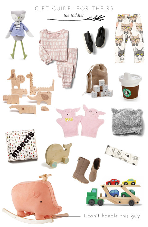 FOR TODDLER: Whale Push Toy: Brika | Headband: Brika | Smarty Cat Leggings: Brika | Piglet Bath Mitts: Brika | Owl Stuffy: Brika | Wood Animals: Brika | Wooden Blocks: Brika | Cloth Insect Book: Brika | Christmas Pyjamas: Gap | Slip on Sneakers: Gap | Tall Boots: Gap | Bear Beanie: Gap | Coffee Sippy Cup: ThinkGeek | Pig Rocker: Land of Nod | Trucks: Nordstrom