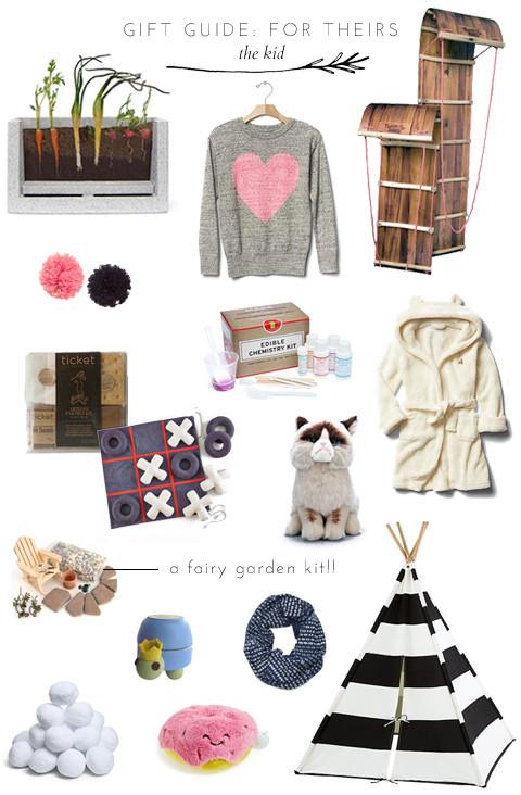 FOR KIDS: Wood Toboggan: Horne | Mini Infinity Scarf: Brika | Hair Clips: Brika | Tooth Fairy Box: Brika | Edible Chemistry Set: Think Geek | Bear Robe: Gap | Heart Sweater: Gap | Anytime Snow Balls: ThinkGeek | Mini Garden: ThinkGeek | Striped Tee Pee: Land of Nod | Tic Tac Toe: Land of Nod | Fairy Garden Set: Etsy | S’more Kit: Terrain | Grumpy Cat Toy: Urban Outfitters | Plush Donut: Nordstrom